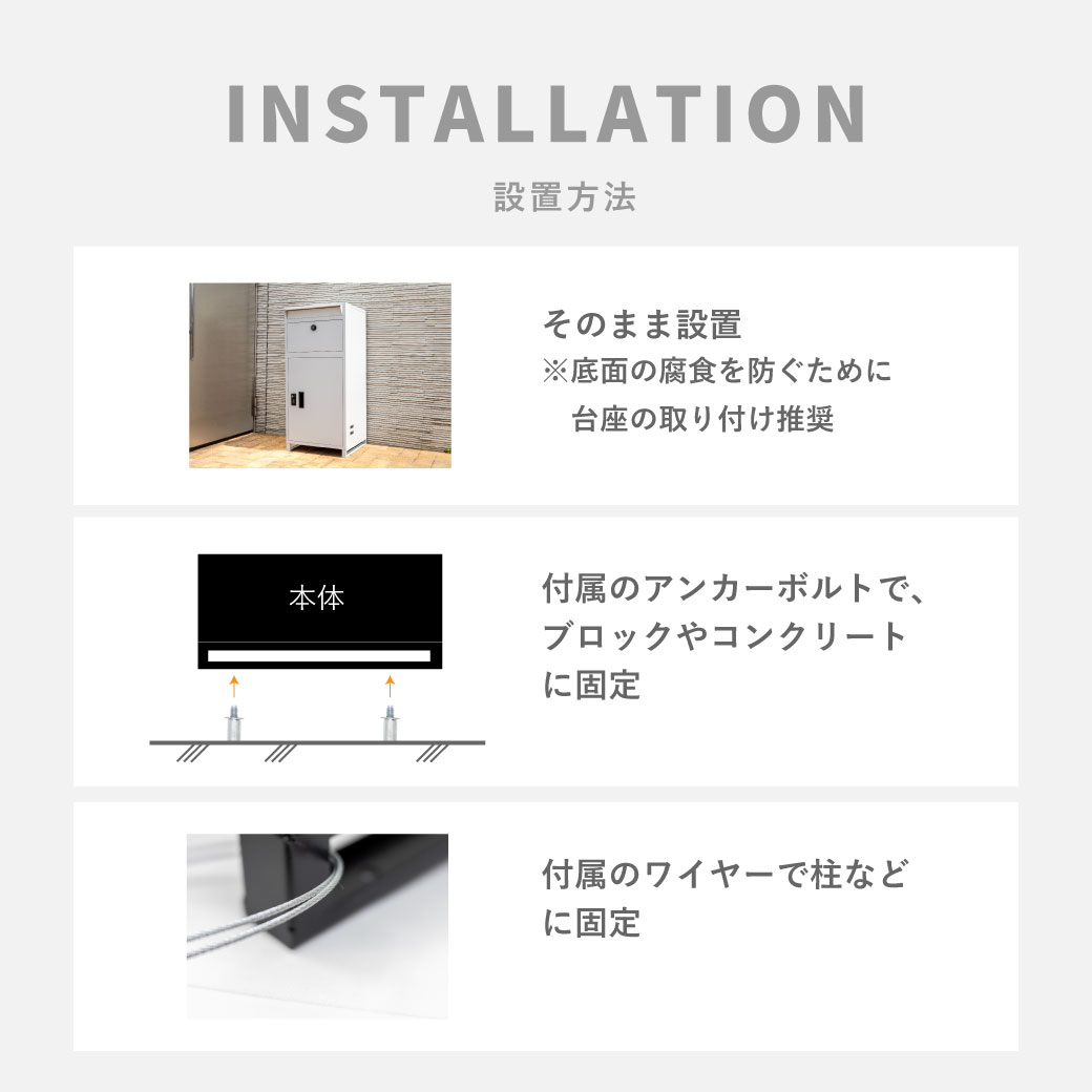 - 付属のワイヤー&アンカーボルトで門柱やコンクリートブロックに固定できる